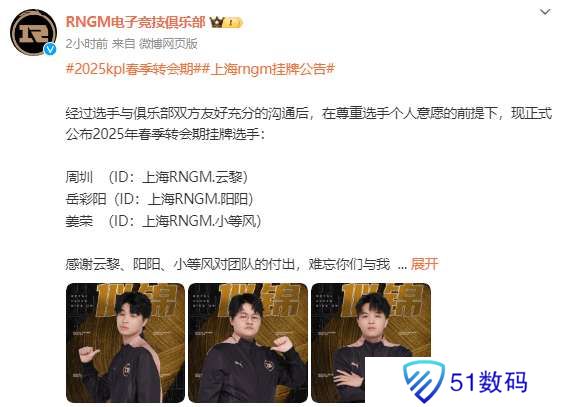 虎扑01月20日讯 RNGM挂牌公告:云黎、阳阳、小等风3人正式挂牌