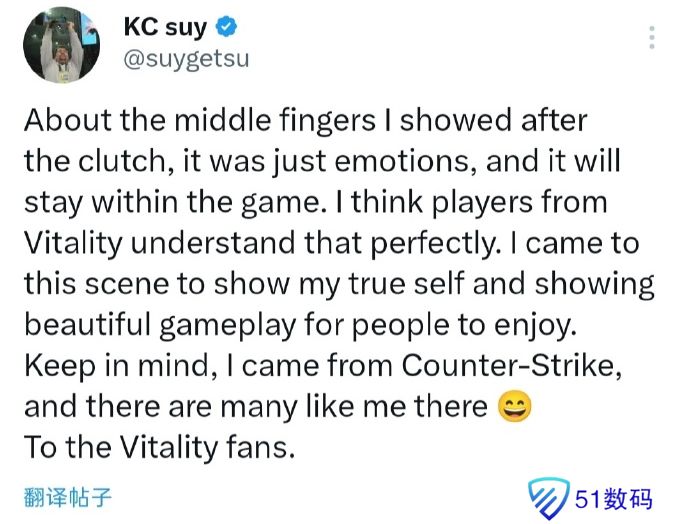 日前在KC与VIT的启点赛比赛中,KC战队的选手suygetsu在决胜局朝着VIT竖起了中指,引发了网友热议。对此,KC suygetsu在赛后发推进行了回应:
