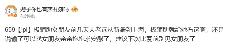 “极辅助女朋友前几天大老远从新疆到上海,极辅助就给她看这啊,还是说输了可以找女朋友亲亲抱抱求安慰了,建议下次比赛前别见女朋友了。”