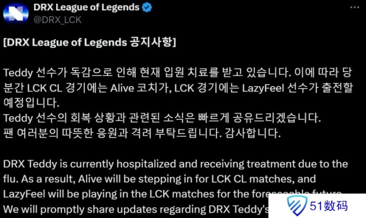 DRX官方:Teddy因流感入院治疗,越南选手LazyFeel将继续参加LCK