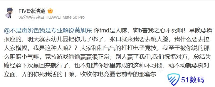 直播吧1月21日讯 今日iG股东之一——张浩瀚发微博“怒喷”知名电竞人黄旭东。(疑似开玩笑)
