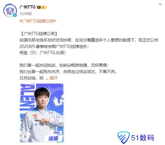 【广州TTG挂牌公告】经俱乐部与选手友好交流协商,在充分尊重选手个人意愿的前提下,现正式公布2025KPL春季转会期广州TTG挂牌选手:杨垒(ID:广州TTG.仙语)我们曾一起共迎挑战,在峡谷畅游驰骋,无所畏惧;我们也曾一起同舟共济,共同走过低谷浮沉,不离不弃。日月如梭,我们共同谱写了诸多故事,或是高光,或有失意。但一直以来,我们始终怀揣着同一个目标坚定向前。我们坚信星星会一直闪耀,金子也一定会发光。感谢仙语选手在队期间的辛勤付出,他的汗水和努力构成了我们彼此独一无二的回忆。长风破浪会有时,直挂云帆济沧海。不论结果如何,衷心祝愿仙语选手前程似锦!在未来的职业生涯中,继续发光发热!