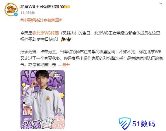 今天是北京WB梓墨(吴喆杰)的生日,北京WB王者荣耀分部全体成员在这里祝梓墨21岁生日快乐!