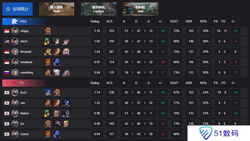 来自T1的BuZz选手拿到了全场最高的55总击杀,他的队友Meteor以及PRX战队的牢靖Jinggg并列拿到了51总击杀。