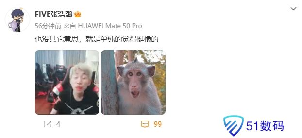 直播吧1月22日讯今日iG股东之一——张浩瀚发微博分享了Doinb的在直播截图画面和一张猴子的图片,并配文:也没其它意思,就是单纯的觉得挺像的。