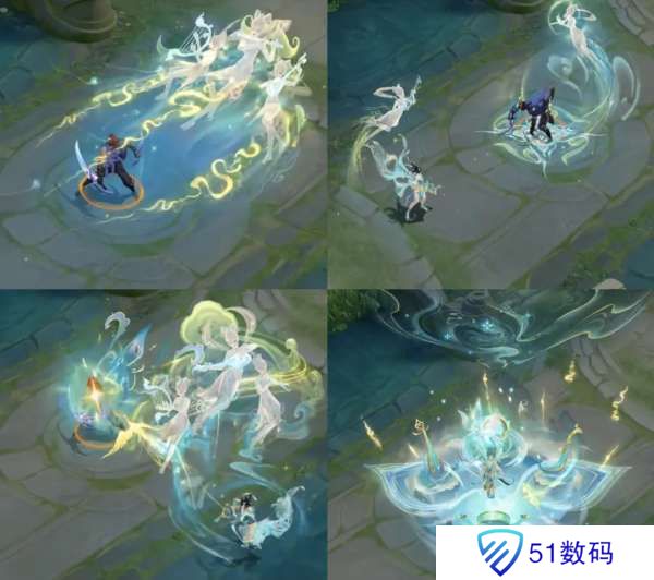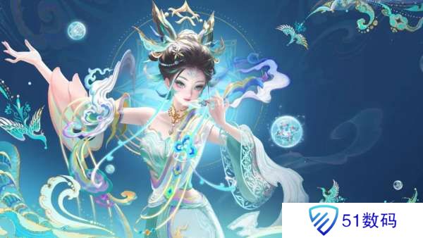 技能特效以蓝青色和金色为主色调,融入了乐谱、神鸟、天女、凤尾和四合如意纹元素,创意谈不上惊艳,但整体质感还算不错。