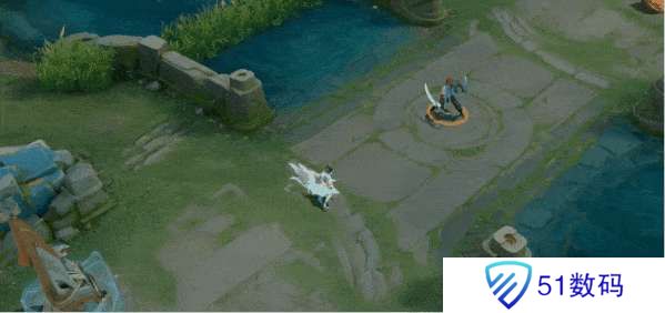 三技能:虞姬纵身一跃敌人身后升起金色日晷,指针旋转惊起飞燕,落地后脚下绽放瑰丽的太阳纹图腾。
