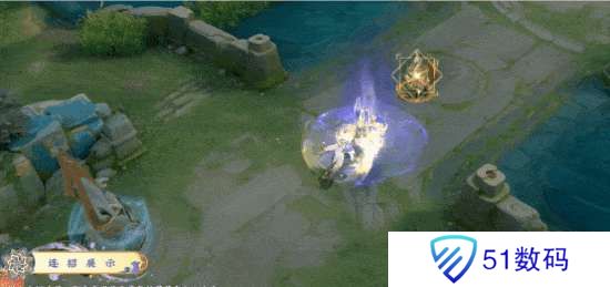 四技能:女娲蓄力灵蛇携带蓝金色能量波飞出,地面浮现人间昌盛绵延之景。