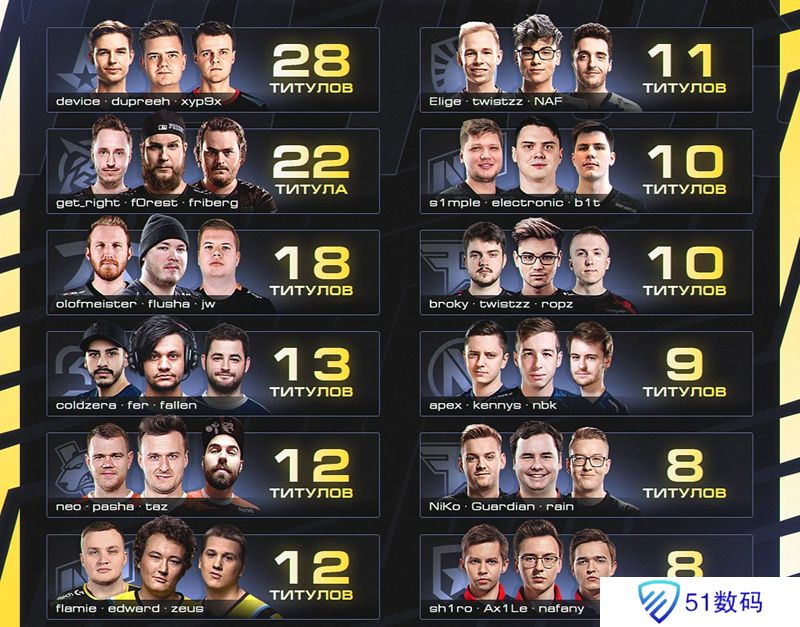 共有12个组合上榜这份名单,其中以dupreeh、device和Xyp9x组成的三叉戟最为耀眼,在三人合作期间,一共拿到了28个大大小小的冠军,其中还包括四个Major冠军,但随着device加盟