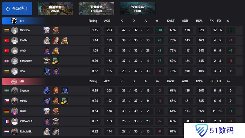 回到比赛,图一幽邃地窟,TH 4:13 M8,图二裂变峡谷,TH上半场直接一波11:1拿到胜势,比分最终锁定在TH 13:3 M8,图三深海明珠,TH 13:8 M8。MiniBoo选手拿到了全场最高的42总击杀。
