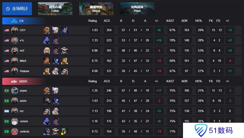 2025 VCT 美洲启点赛,败者组首轮,C9迎战MIBR。图一C9选择莲华古城,两队上半场战成6-6平手,但下半场OXY火力全开,C9以铁血防守直接13-7先下一城。图二MIBR选择幽邃地窟,MIBR上半场全员发力轰下10分,但下半场却同样屡屡失守,被对手一度将比分迫近至11-10,但MIBR还是顶住压力拿下最后两回合,以13-10有惊无险扳平**分。