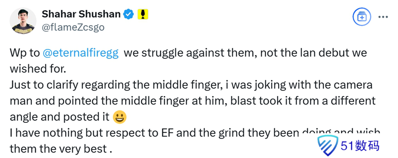 我想解释一下竖中指这件事。我是在和摄影师开玩笑,对他做了这个手势。BLAST在直播中从另一个角度截取了画面并展示出来。我尊重Eternal Fire战队以及他们的努力。祝他们一切顺利。”