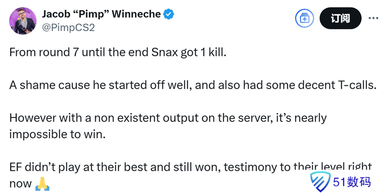 “从第7回合到比赛结束,Snax只拿到1次击杀。