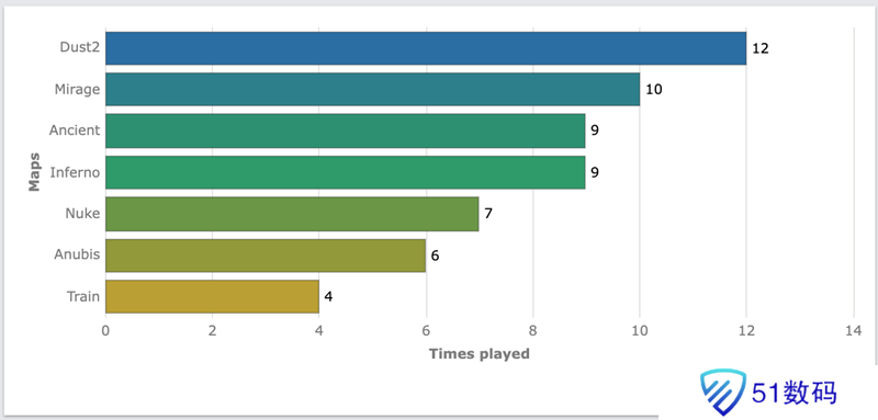 在线上赛阶段,Dust2出场率最高,总计出场12次,紧随其后的分别是Mirage(10次)、Ancient(9次)和Inferno(9次),回归竞技图池的Train则是在该阶段被选出4次。