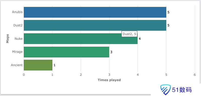 线下赛阶段,Anubis和Dust2登场次数最多,均出场5次,而Ancient仅在该阶段出场一次。
