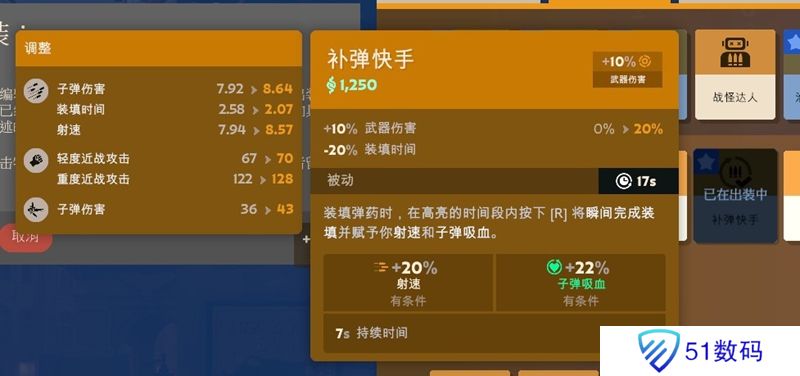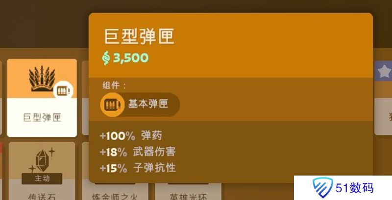 【巨型弹匣】,由【基本弹匣】升级而来,提供100%巨额的弹药量,基本大多数角色都可以出这个,属性也不错。