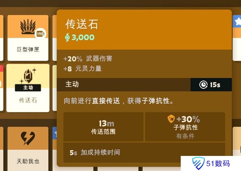 【传送石】,也就是跳刀或者说闪现,高贵的功能性,适合大多数腿短需要位移的角色,也可以用和某些技能进行组合技,例如Infernus(火男)开大招要爆炸时用跳刀炸对面出其不意。