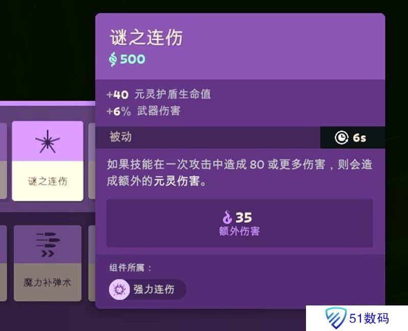 而【谜之连伤】可以适用于拥有单次造成80点以上伤害的技能的角色,例如Warden(警长)、Lady(夫人),可以大大提高前期技能对敌人的消耗效果。