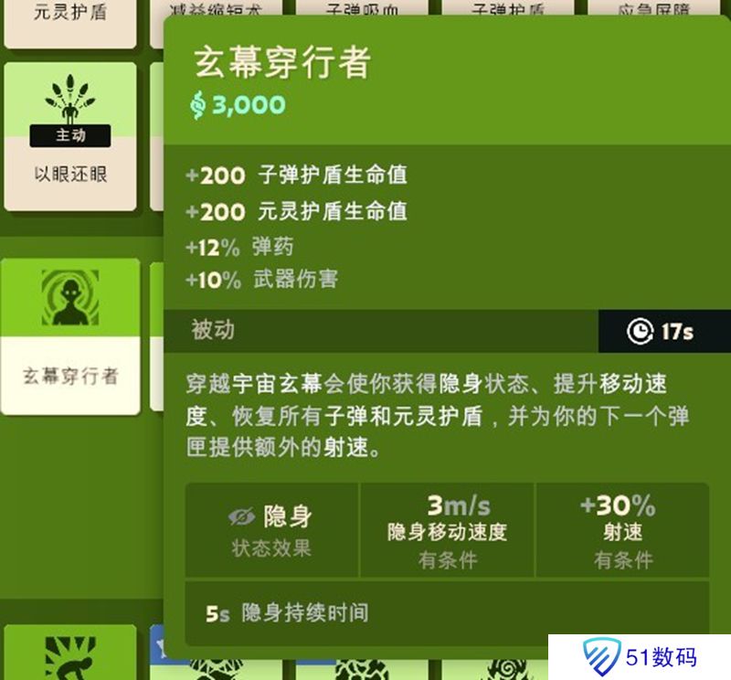 【玄幕穿行者】,3000G唯二的好用肉装,200双盾,还能提升弹药和武器伤害,并且熟悉地图后,可以利用玄幕刷新护盾,甚至可以利用这个隐身效果配合队友抓人。