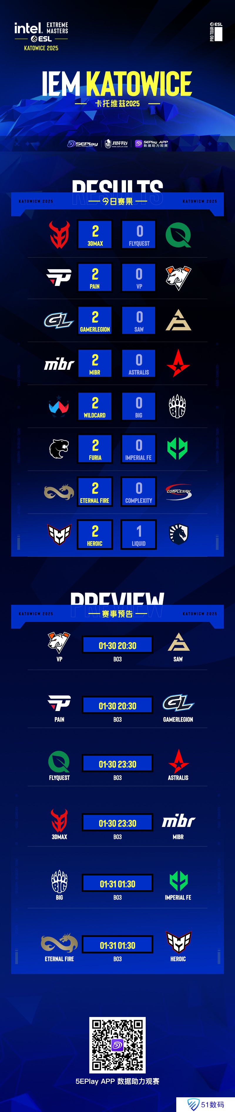 Liquid则是掉入败者组。明日将会有VP和SAW、A队和FQ、BIG与Imperial fe的生死局上演!以下为今日赛果、明日预告一览: