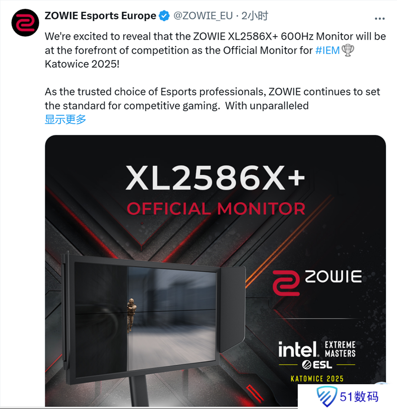 日前卓威在社交平台上宣布,旗下电竞显示器XL2586X+将作为IEM 卡托维兹站的赛事显示器。