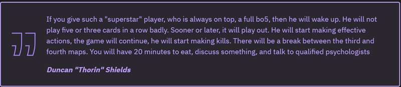 “如果你给这样一个‘超级明星’选手,始终处于巅峰状态的选手,一场完整的BO5比赛,他会醒过来。他不可能连续五张或三张地图打得不好。迟早,他会打出有效的操作,游戏会继续进行,他会开始拿下击杀。第三张和第四张地图之间会有一个休息,你将有20分钟的时间吃饭、讨论一些事情,还可以和合格的心理学家交流。”