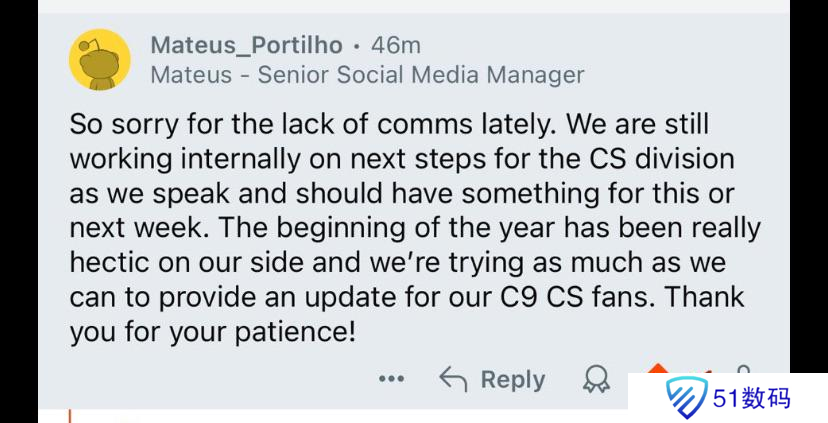 “很抱歉最近没有任何相关消息,我们仍在内部探讨CS分部的下一步计划,本周或者下周应该会有一些消息。今年年初俱乐部非常繁忙,我们正在尽最大努力为Cloud9的粉丝们提供最新消息。感谢大家的耐心!”