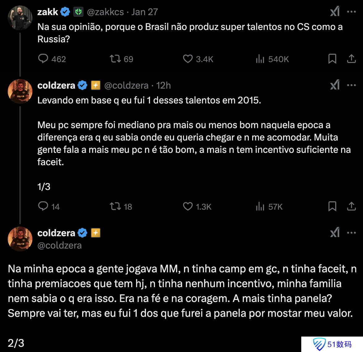 近日,巴西传奇选手coldzera参与了zakk在社交媒体上提出的关于巴西为何不能像俄罗斯那样培养出那么多天才少年的辩论。在coldzera看来,两国之间的社会经济差异是一个因素,但主要原因还是在于巴西人的心态问题。