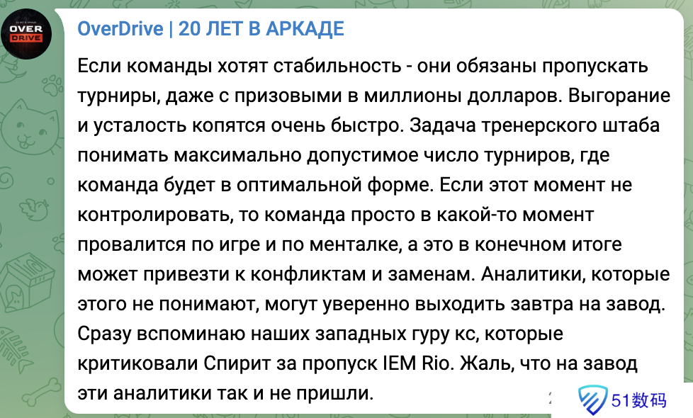 “如果战队想要保持稳定,就算是有数百万美金的奖金池,他们也不得不放弃一些比赛。不然倦怠和疲劳会迅速累积,教练组的任务就是了解战队能够达到最佳状态所需要的时间,以及极限状态下的比赛场次。如果不控制这一点,战队就会在某些时候在发挥和心态上出现问题,最终导致冲突和换人。没有意识到这一点的分析师,明天就可以进厂了。这让我想起了当时批评Spirit跳过IEM 里约的那些西方分析师们,就好像是从来没有参与过这些工作一样。”