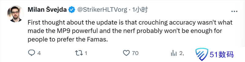 Striker:对于这次更新,我的第一反应是,蹲下射击精度并非MP9强大的原因,而且这次削弱可能还不足以让人们更喜欢法玛斯。