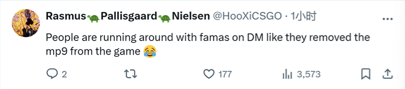 HooXi:人们在死亡竞赛模式中拿着法玛斯跑来跑去,就好像游戏里移除了MP9一样(笑哭)。