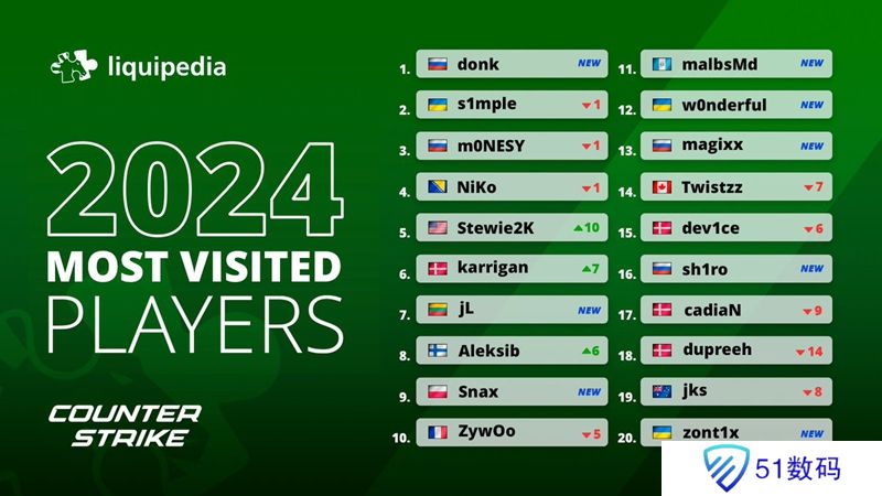 液体百科:donk为2024年最高访问量选手,s1mple位列第二