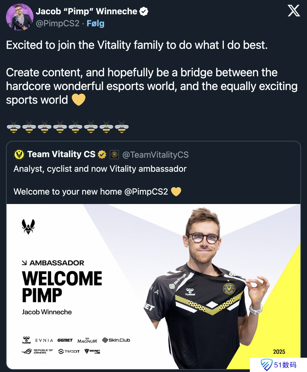 Vitality战队形象大使。该俱乐部于周三在官方社媒账号公布了这一消息。据这名丹麦分析师解释说,作为品牌形象大使,他将为其创作内容,并努力在电竞和体育世界之间架起一座桥梁。