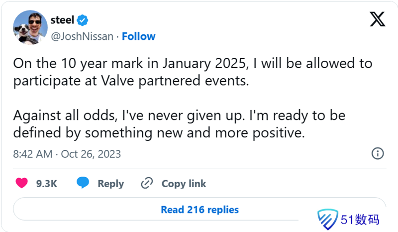 在被禁赛十周年之际,steel的禁令被解除,这意味着他现在能够参加Major赛事。