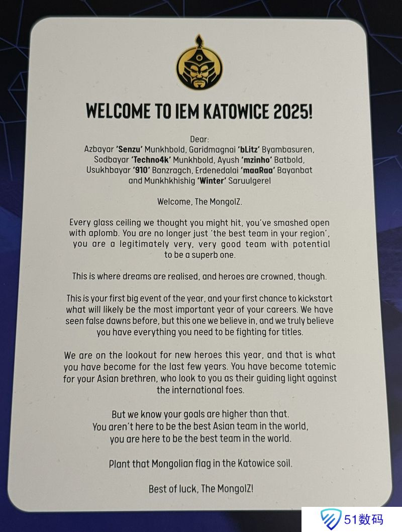The MongolZ在社交平台上晒出了2025 IEM 卡托维兹站赛事寄语。