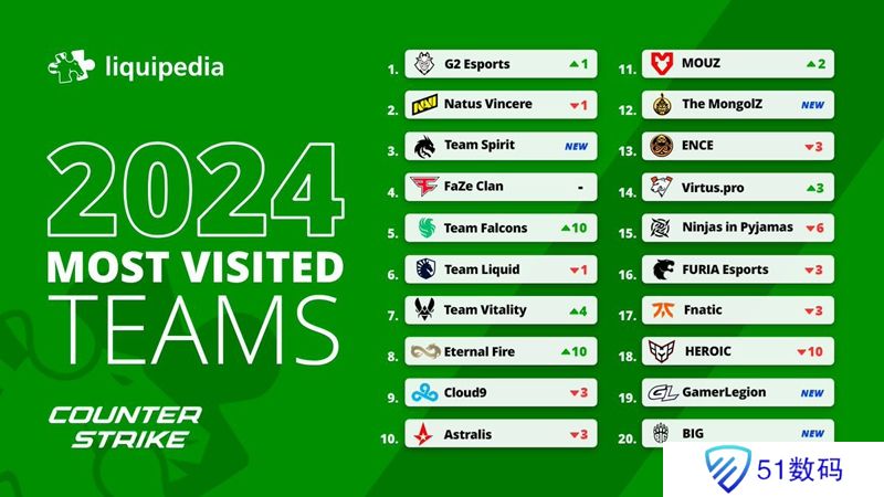 日前液体百科分享了2024年CS百科页面中访问量Top20战队。排名第一的是