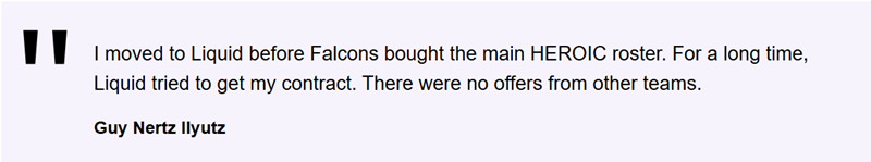 Falcons买下HEROIC主力阵容之前,我就转会到了Liquid战队。很长一段时间里,Liquid战队一直试图拿下我的合同。当时我没有收到其他战队的offer。”