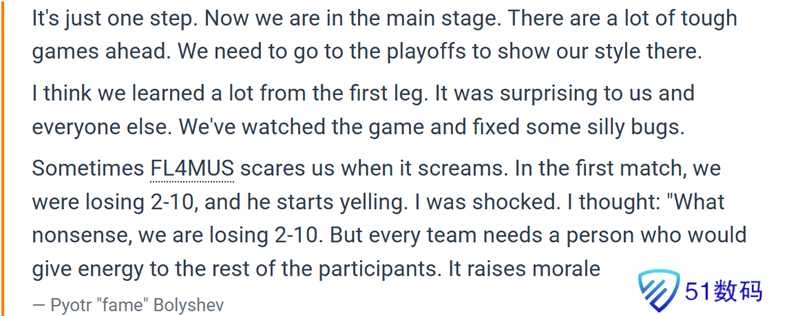 Virtus.pro战队选手fame分享了自己对队伍晋级卡托维兹站正赛的看法。他表示队伍在赛事开局不利后吸取了教训。