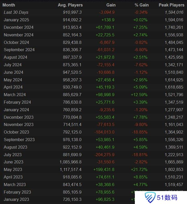 据统计,CS新版本的峰值在线人数在一月份有所下跌。一月份CS月平均在线人数增加138人,平均在线人数为914000人。同时在线人数峰值从170万跌至150万。