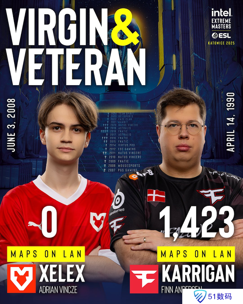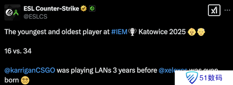 在IEM 卡托维兹站2025开赛前,赛事主办方ESL公布了一项趣味统计。在所有参赛选手中,最年轻的选手和最年长的选手分别是16岁的