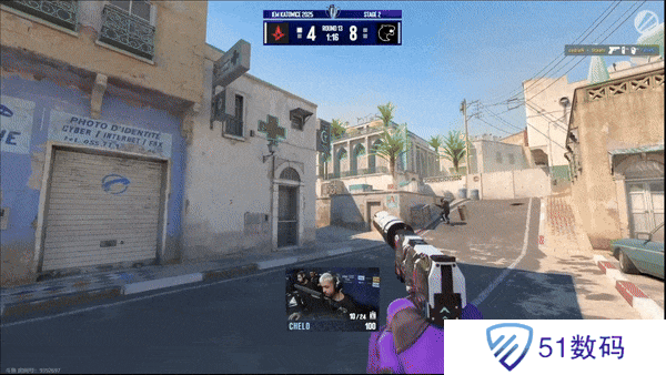 下半场攻守互换。CT主动反清侧道拿到首杀打断A队的飞二楼节奏,放下雷包后形成二打二残局,chelo封烟强拆雷包拿下下半场手枪局。