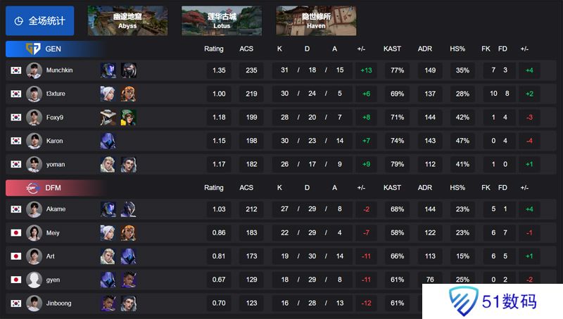 2025 VCT 太平洋启点赛,败者组第三轮,GEN对阵DFM。两队实力差距较大,GEN全队五人发力,在幽邃地窟和莲华古城上均以13-6轻松取胜,直落两图横扫淘汰DFM,顺利与TLN会师败者组第四轮。