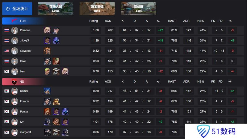 2025 VCT 太平洋启点赛,败者组第三轮,TLN对阵NS。图一NS选择莲华古城,primmie独木难支,NS四人发力在攻守两端均打出优异表现,NS以13-9先下一城。