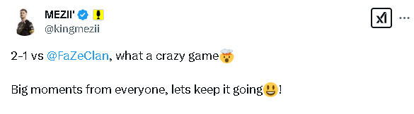 mezii:2-1战胜FaZe,真是一场疯狂的比赛。每个人都有精彩的时刻,让我们继续保持这种势头!