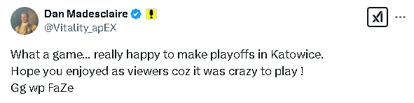 apEX:真是一场精彩的比赛……非常高兴能够在卡托维兹站晋级淘汰赛。希望观众们也能享受这场比赛,因为比赛过程真是疯狂!Gg wp FaZe。
