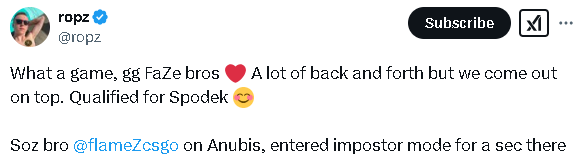 ropz:真是一场精彩的比赛,GG FaZe兄弟们,双方你来我往,但最终我们取得了胜利,成功打进Spodek竞技场。抱歉兄弟@flameZcsgo,在Anubis上,有一瞬间我成“内鬼”了。
