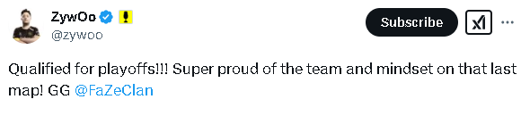 ZywOo:晋级淘汰赛了!!!对团队在最后一张地图上的表现和心态感到非常自豪!GG FaZe。
