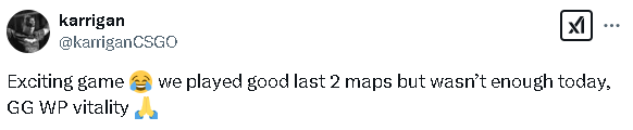 karrigan:精彩的比赛。我们在最后两张地图上表现不错,但今天做的还是不够,GG WP Vitality。