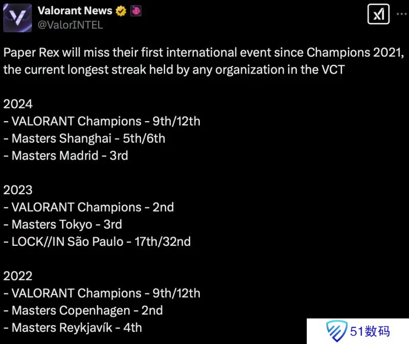 此前,他们已经连续参加了9次世界赛,是VCT中连续参加世界赛次数最多的队伍。
