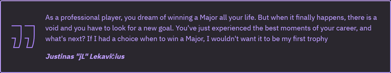 “作为一名职业选手,你一生都梦想着赢得一次Major冠军。但当梦想终于成真,却会感到内心空虚,然后你必须去寻找新的目标。你刚刚经历了职业生涯中最美好的时刻,接下来呢?如果可以选择何时赢得Major冠军,我不希望它成为我的首个奖杯。”